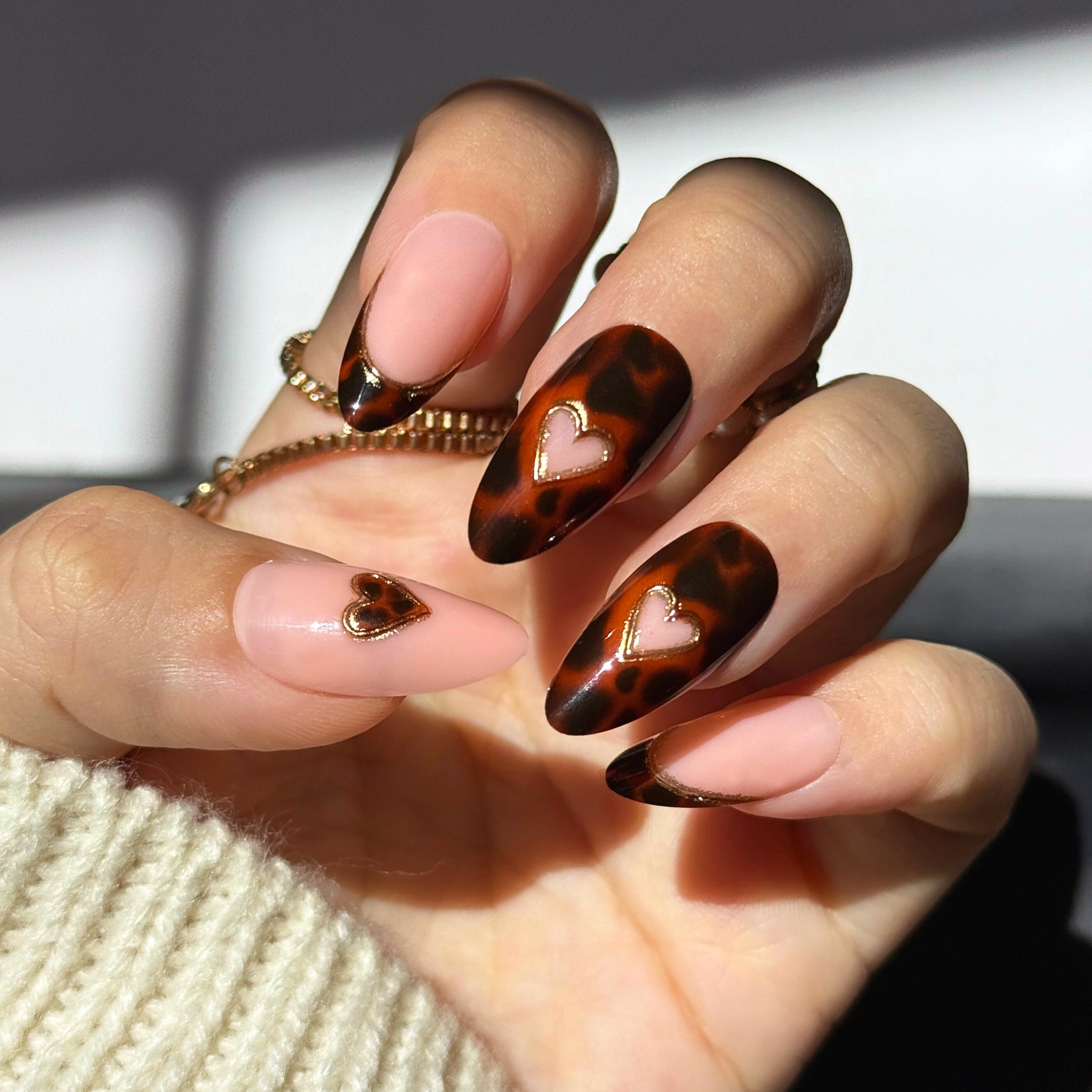 Tapered almond press-on nails featuring a mix of tortoiseshell patterns and peach-nude bases. Some nails have tortoiseshell French tips with gold metallic edges, while others feature 3D gold-rimmed heart charms. The finish is smooth and highly glossy.