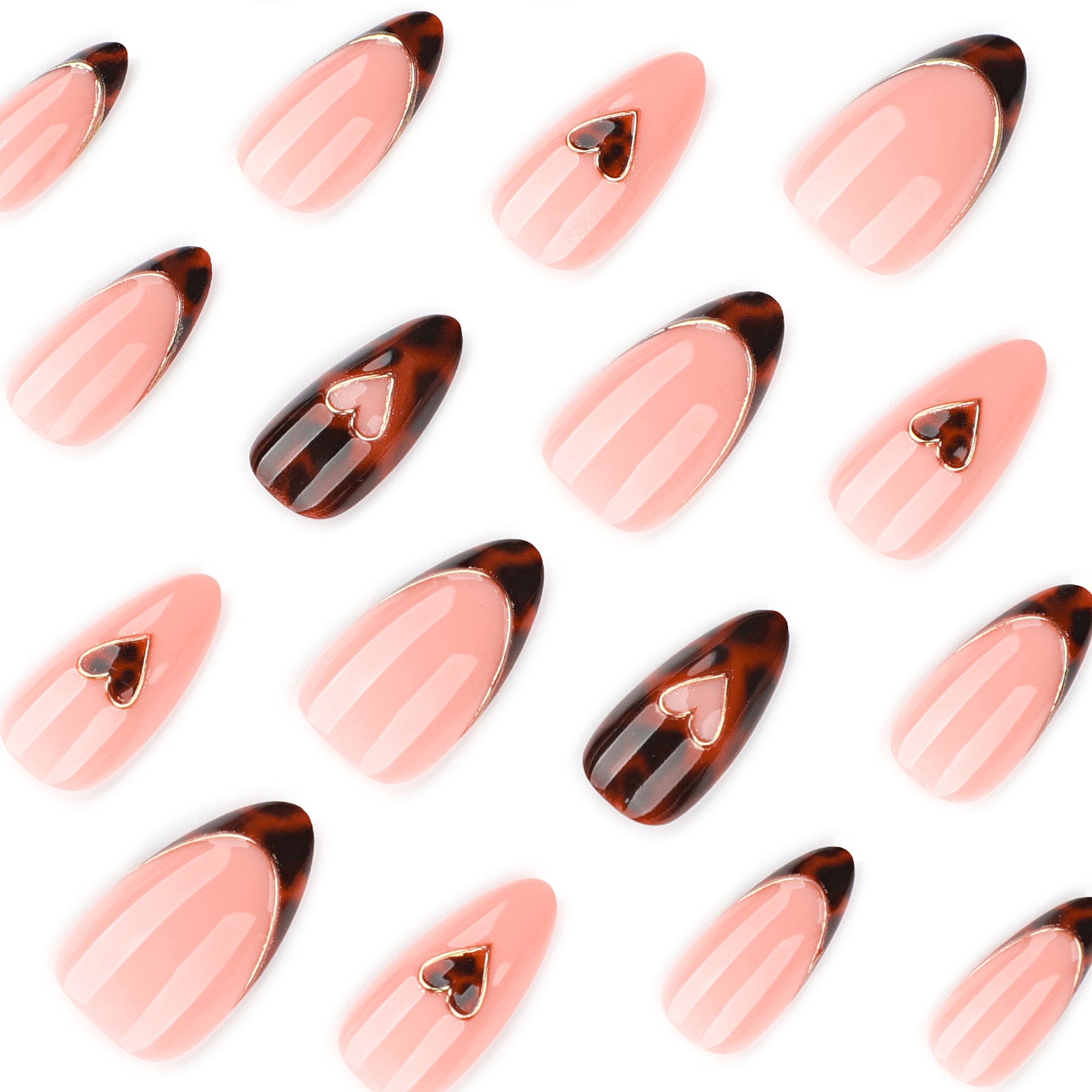 This set features a warm tortoiseshell pattern in deep amber and espresso tones. The design includes French tips defined by a thin metallic gold rim and solid peach-toned accent nails. A 3D gold-rimmed heart tortoise shell-filled centers.