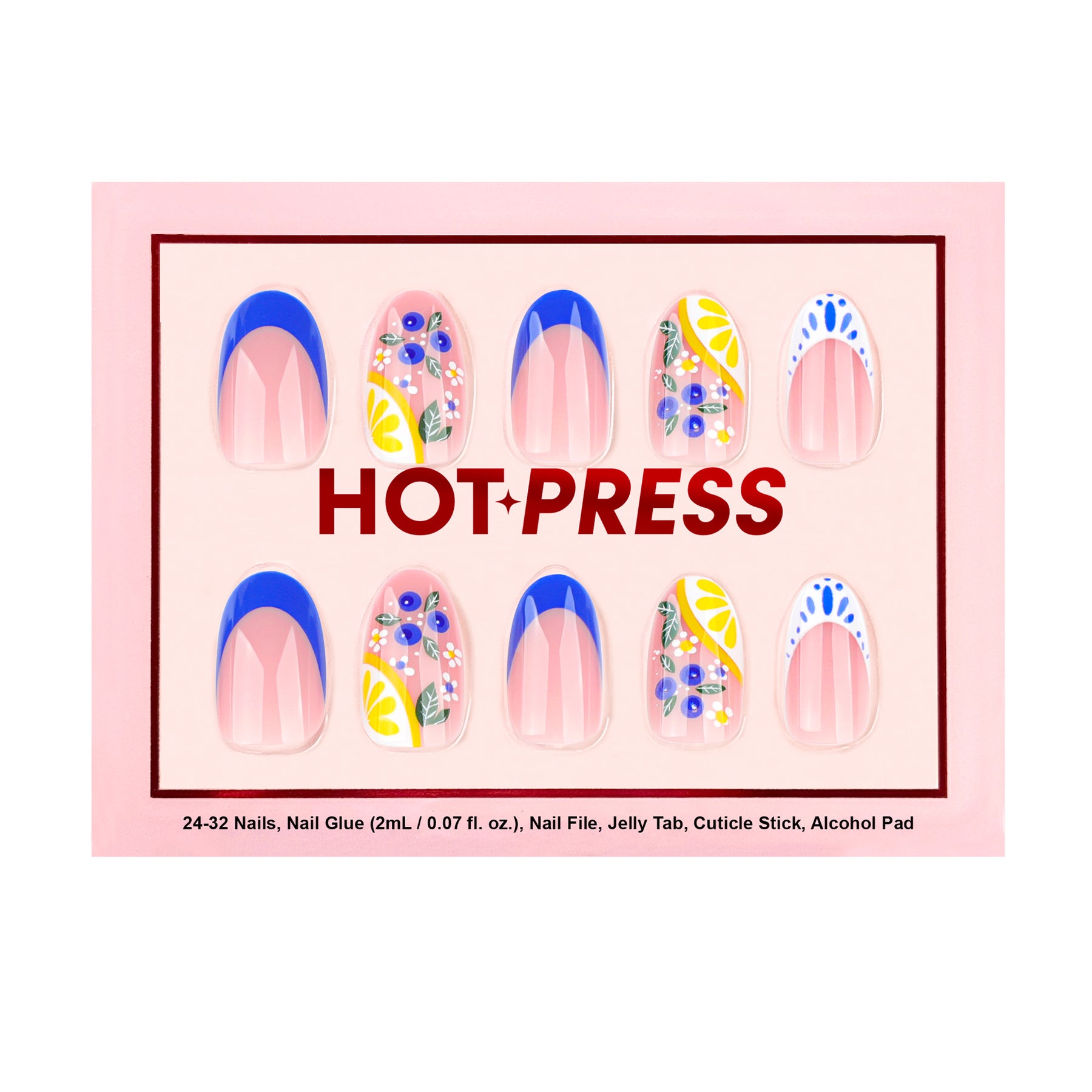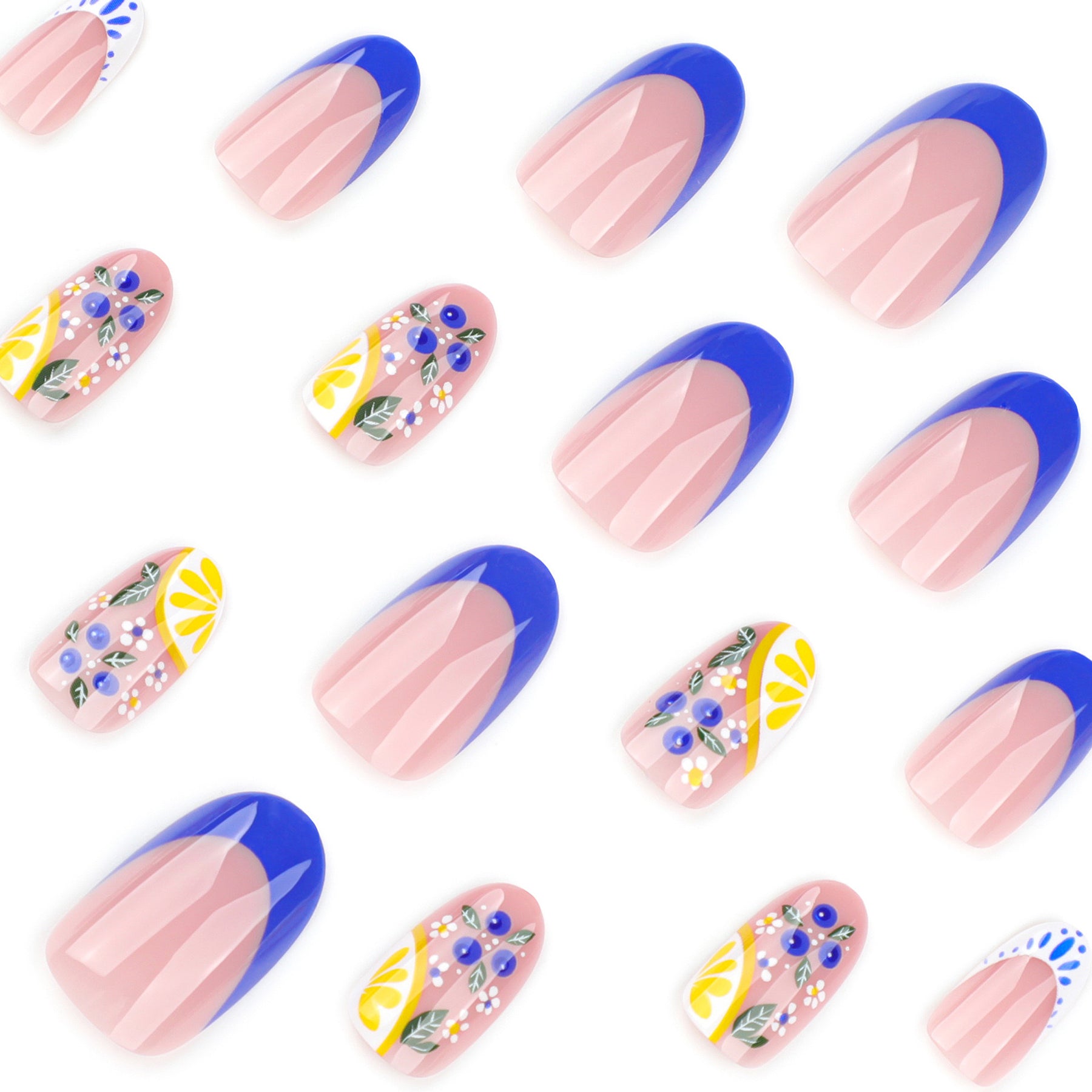 Medium oval press-on nails featuring cobalt blue French tips and detailed lemon slices with blueberry and floral art on a sheer base.