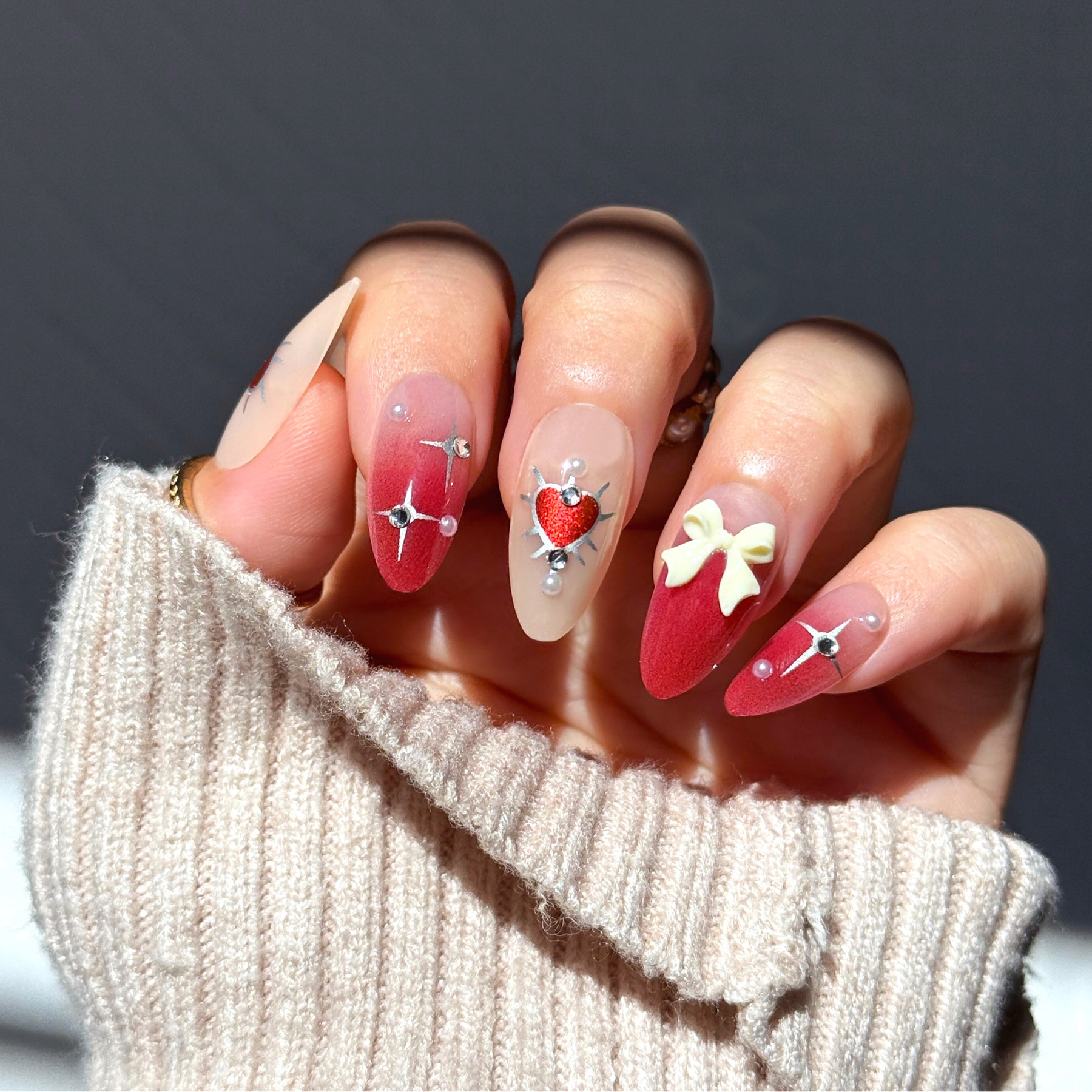 This design features a glowing, ruby-toned aura gradient applied over a sheer, neutral base. The set is detailed with silver chrome starbursts and metallic-contoured hearts for a modern, celestial-inspired aesthetic. It features a 3D sculptural cream-colored ribbon and pearls.